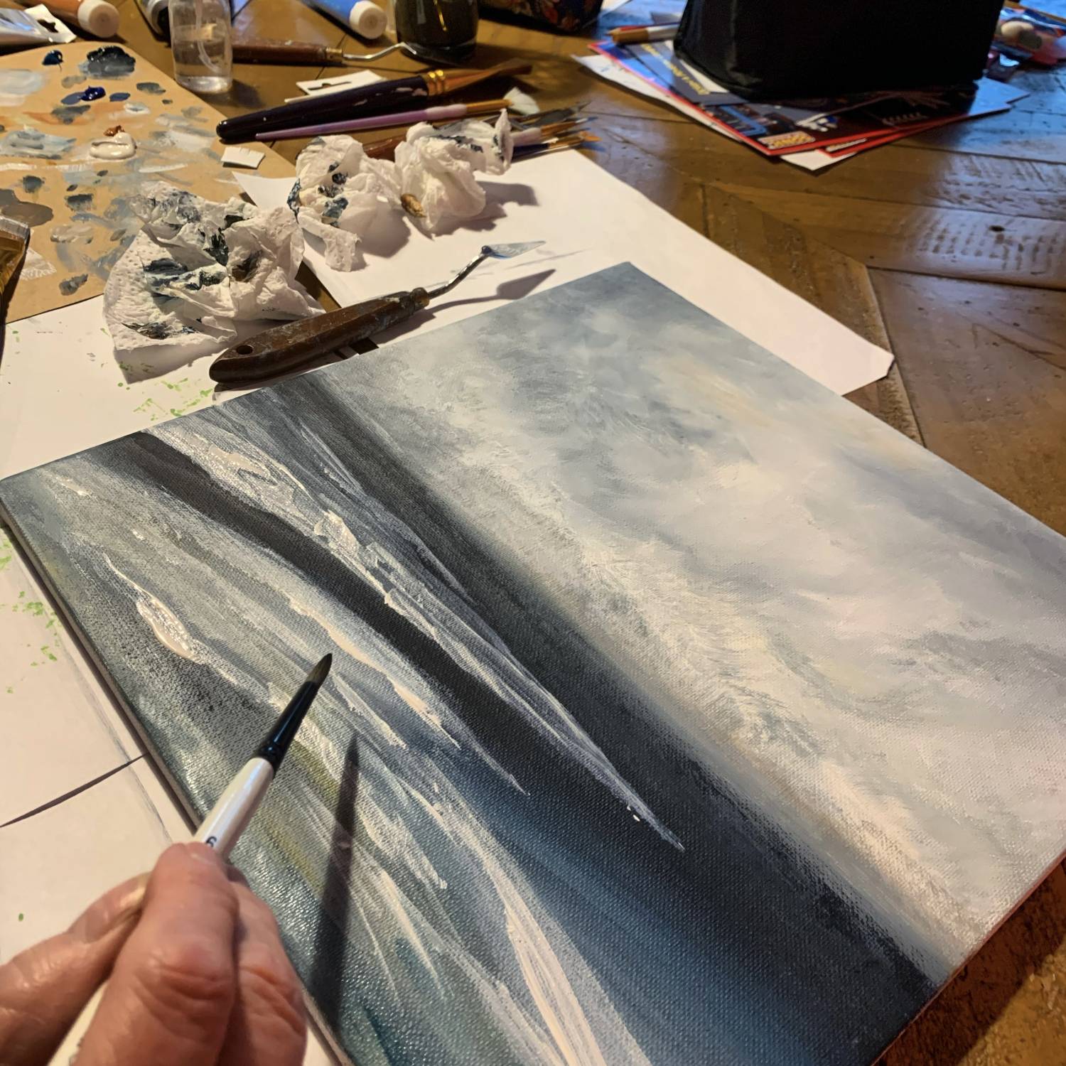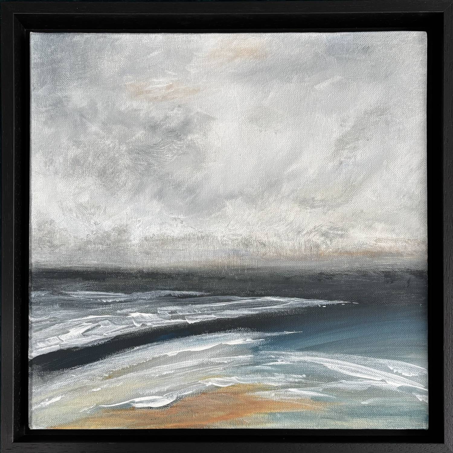 Atmospheric seascape capturing the Cornwall coastline on a cloudy day. Presented in a black solid wood tray frame.