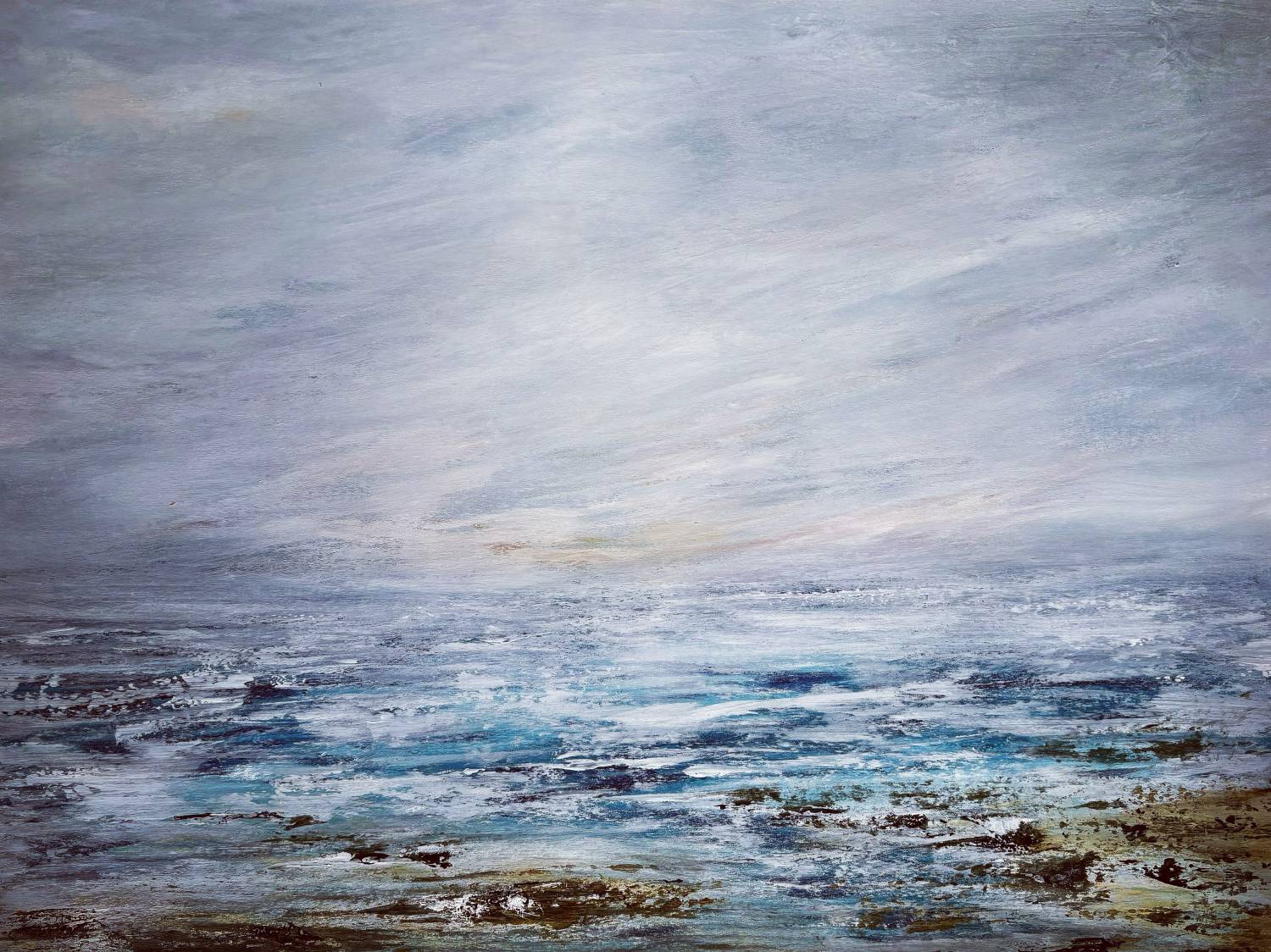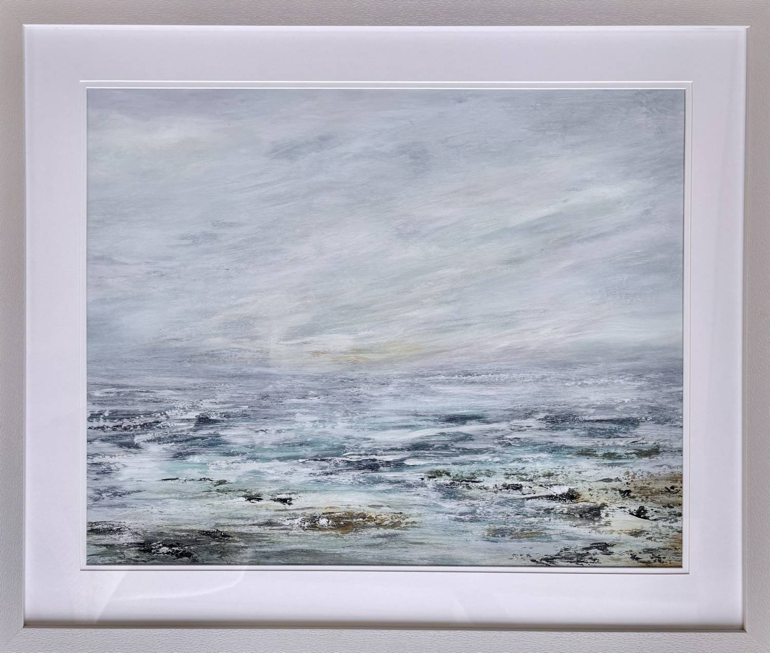 This abstracted seascape provides the viewer with a tranquil scene, it is a very meditative piece providing a sense of contentment. My visits to the shoreline always supports my mental health and rebalances my mind from any concerns or worries within the day, this painting hopes to portray that feeling. The painting is presented in a muted grey frame behind perspex which can be upgraded to glass at an additional cost.