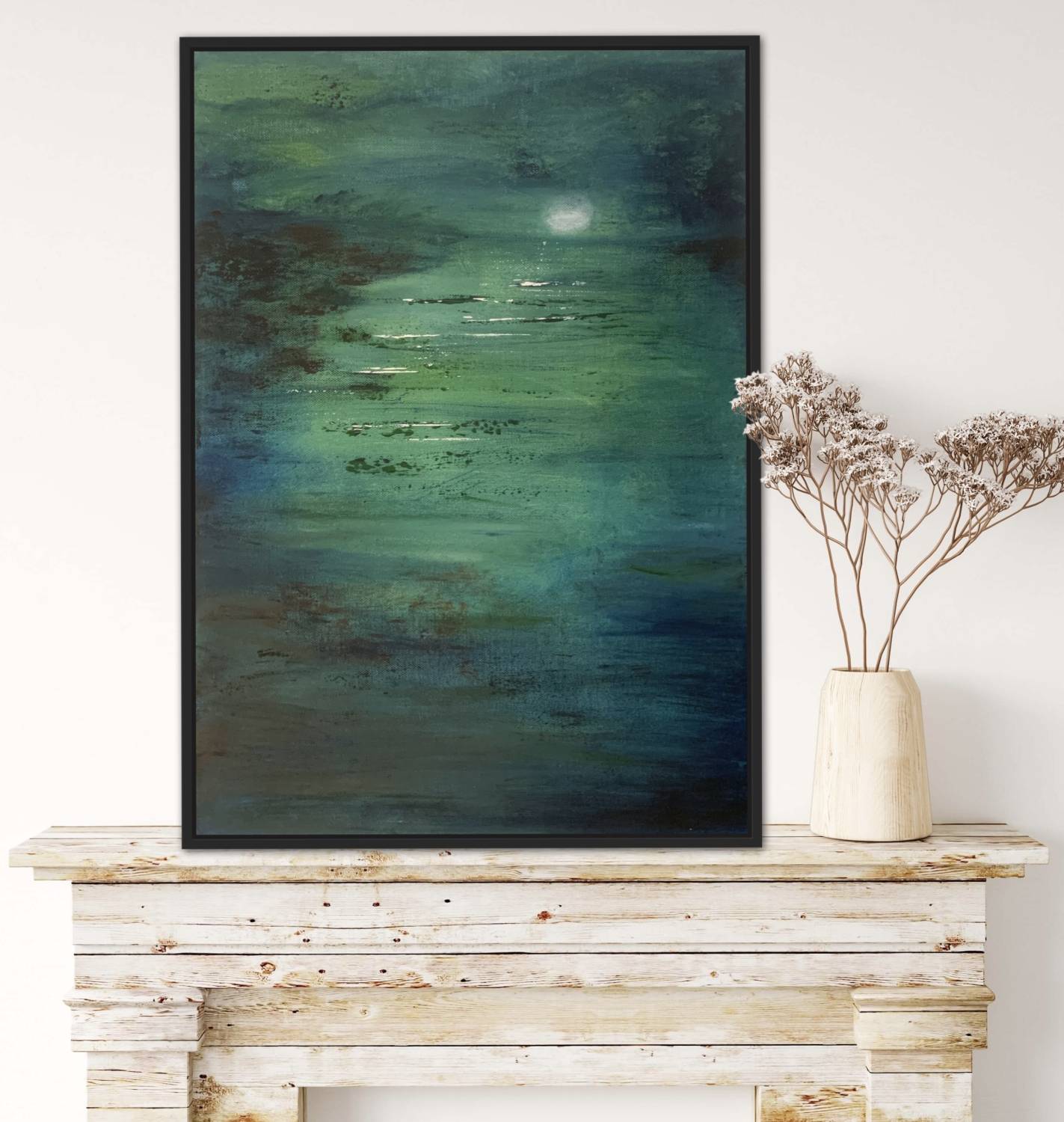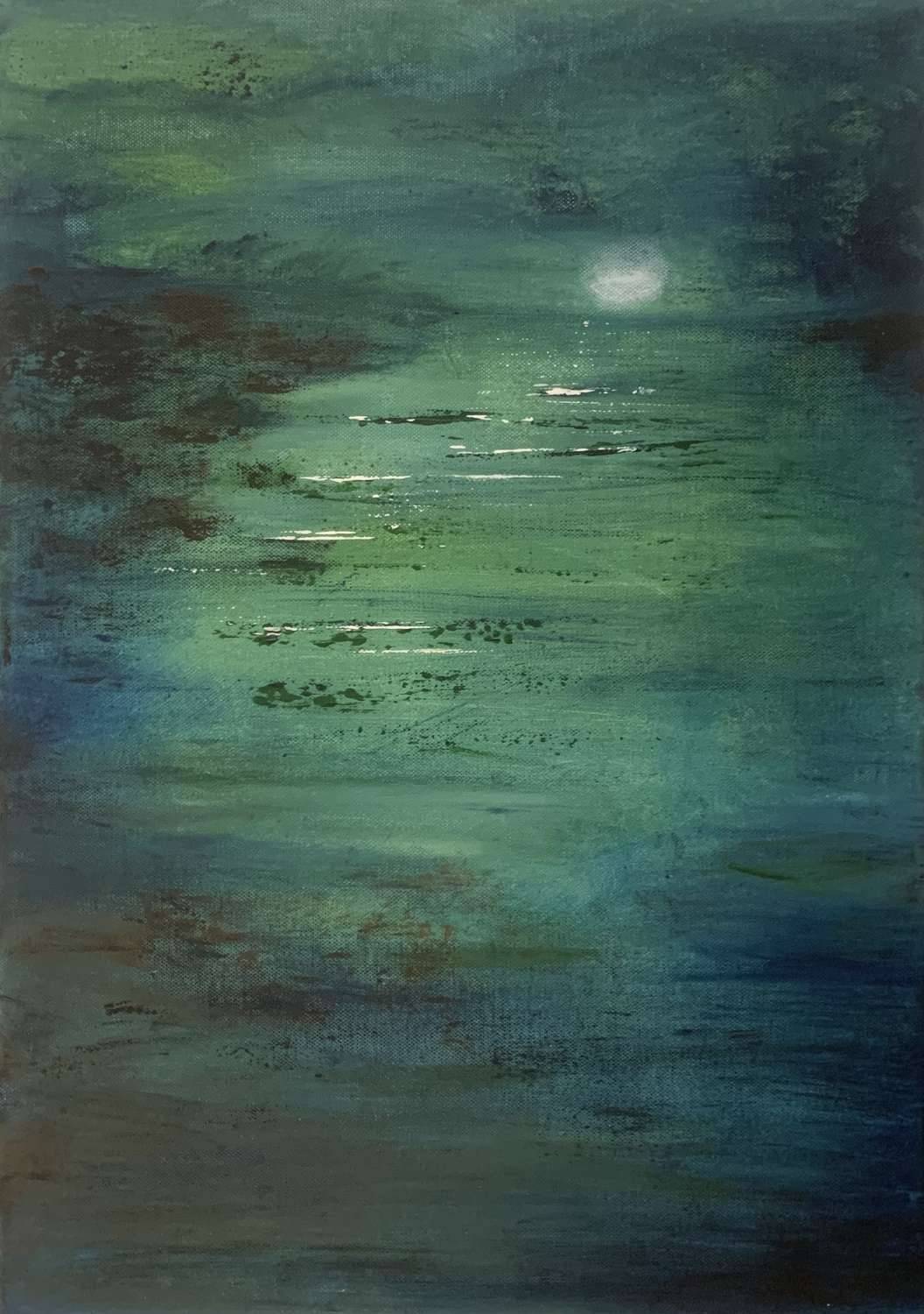 Deep greens and blues draw you into this gentle scene, leaving the imagination to interpret the painting with thoughts possibly of what can be barely seen yet with emotion that can be fully felt in the hazy moon light.