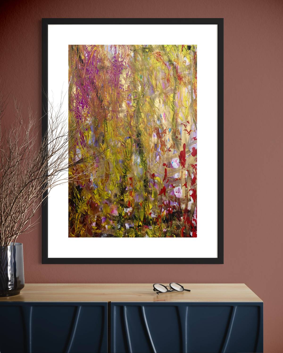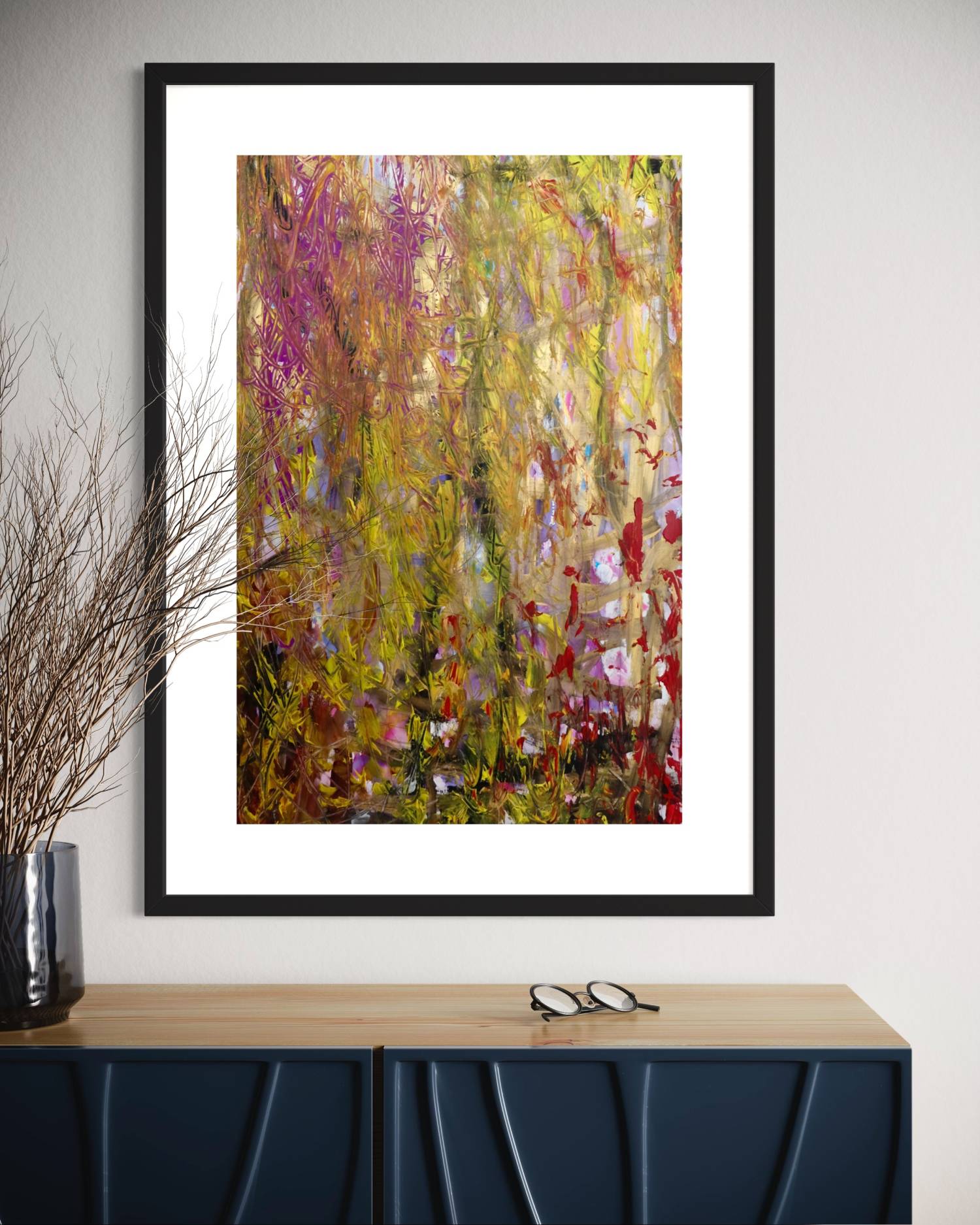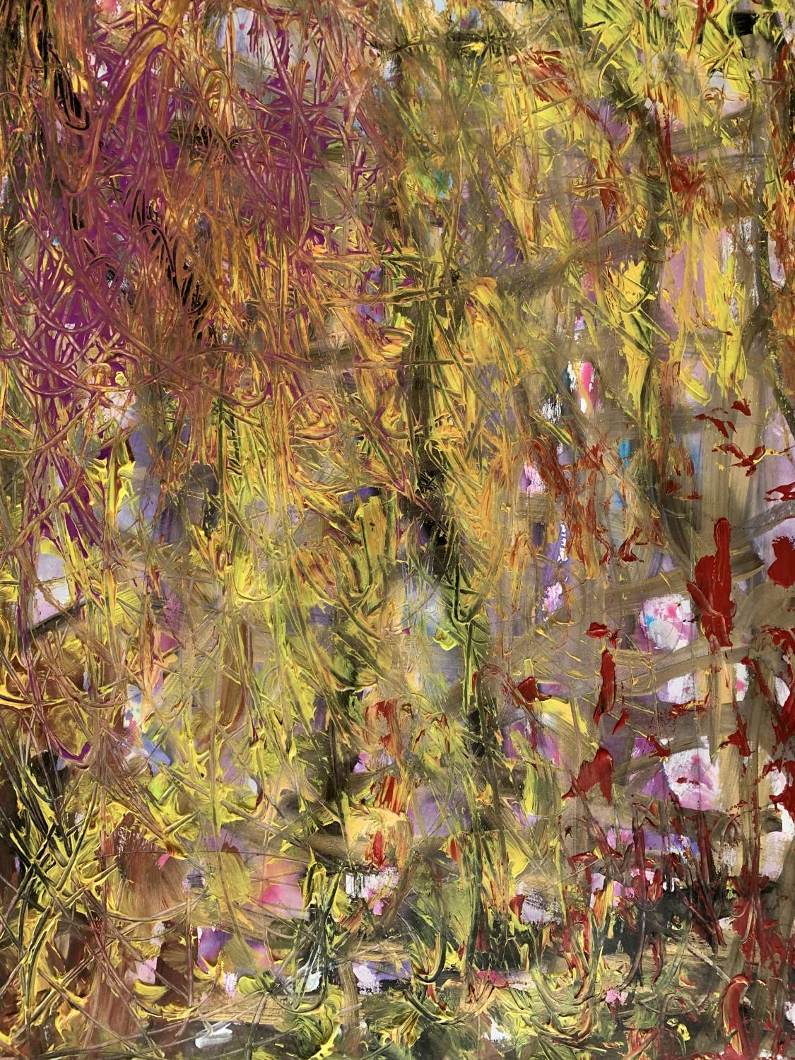 A painting undertaken with deep meditation and intuitive mark making, revealing intriguing layers using different mediums, colours and textures. A joyful piece that glimmers with gold!